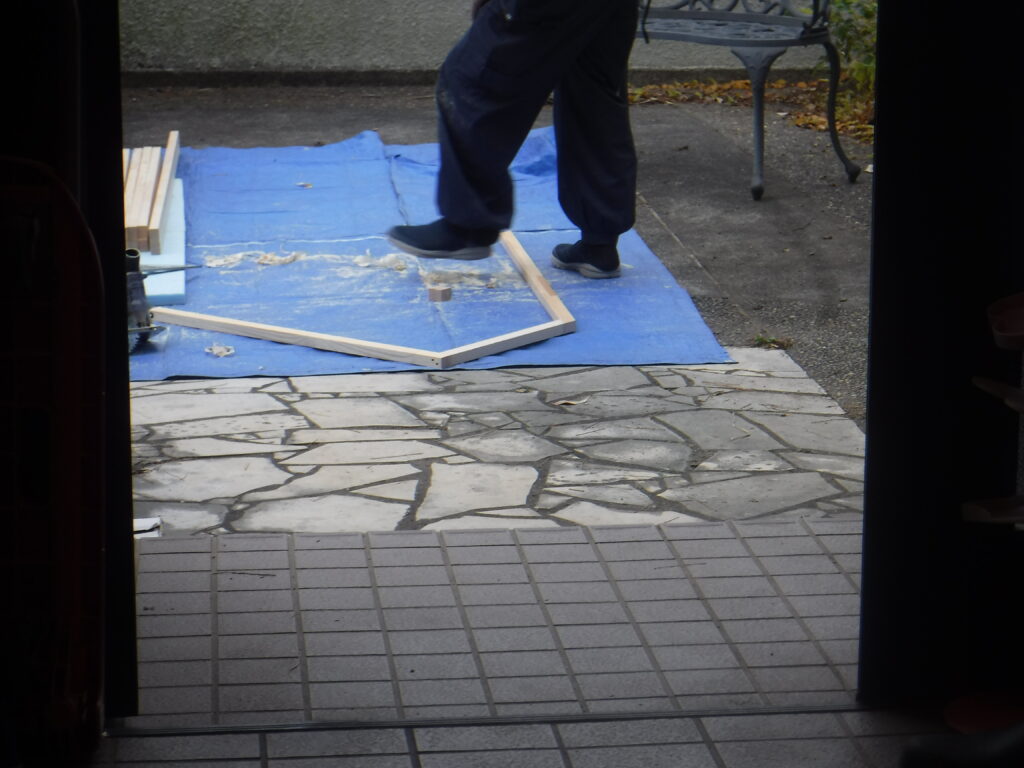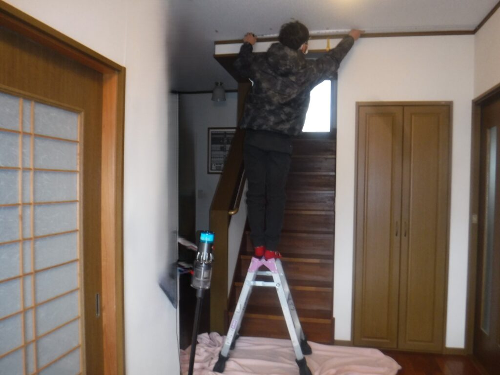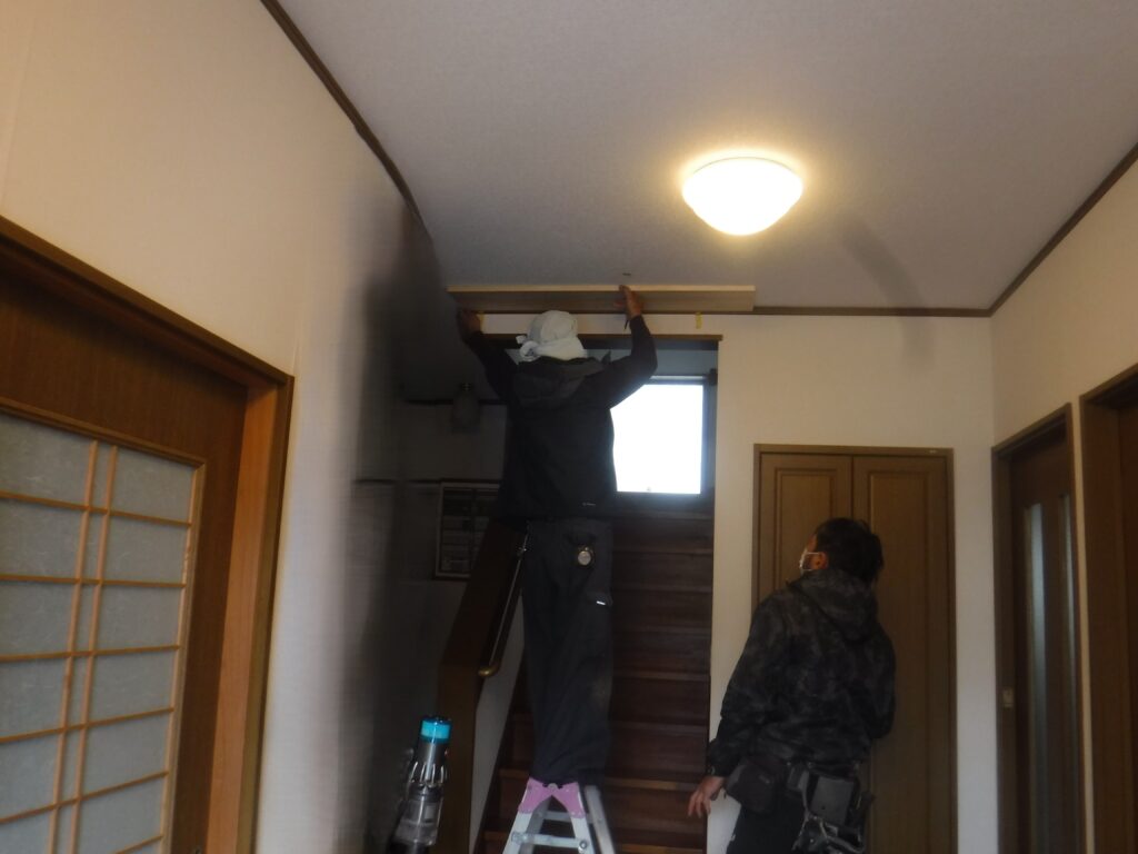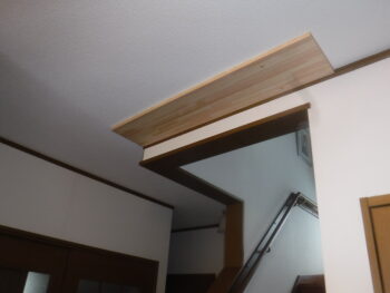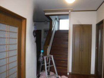 - 階段入り口前にねこ工房製ランマ付きにゃんが-どと脱走防止格子の取付。