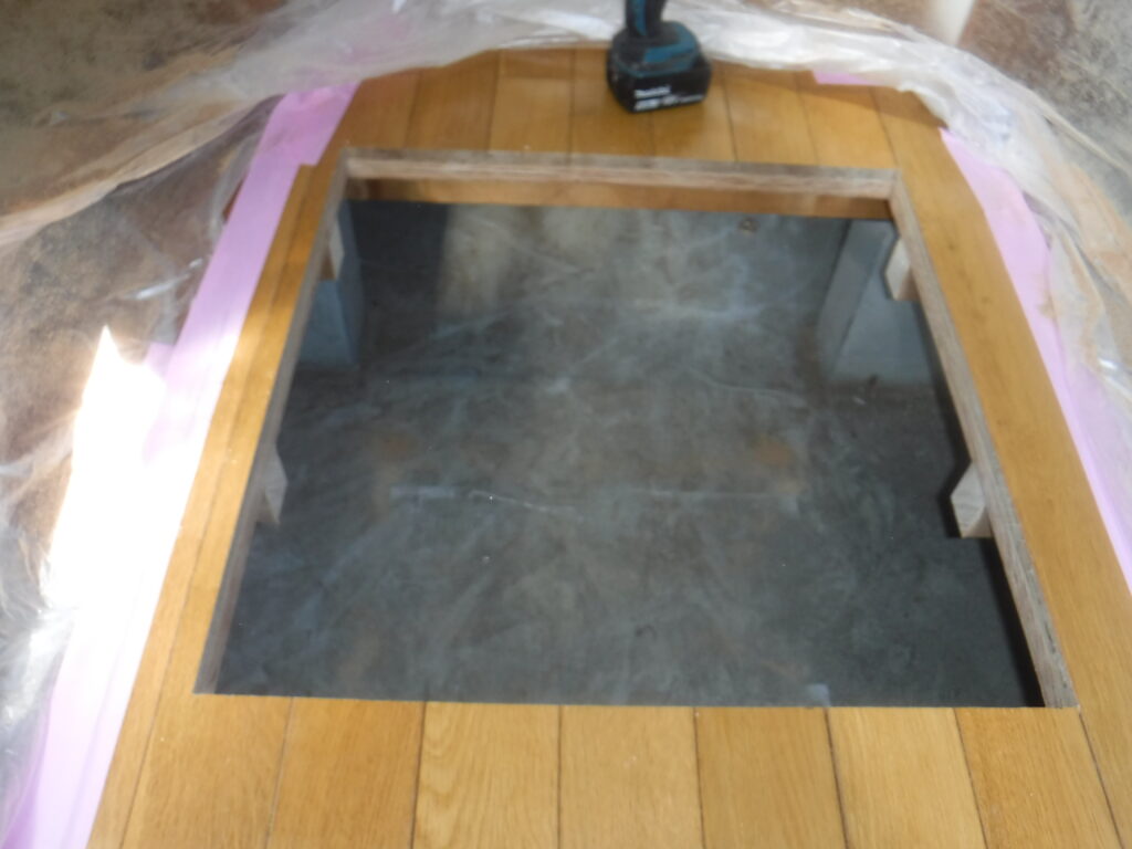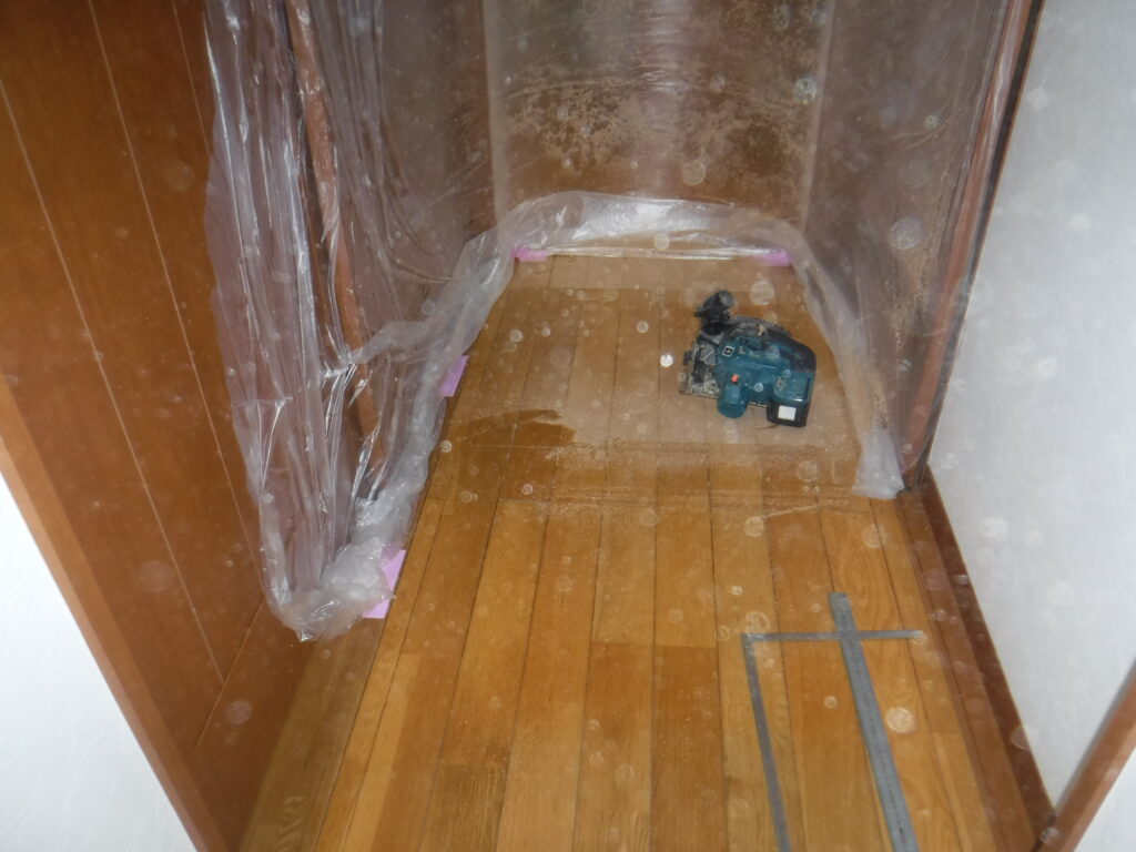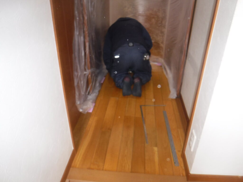 床下を切り抜くので周りをマスカ-で養生をして位置を出します。